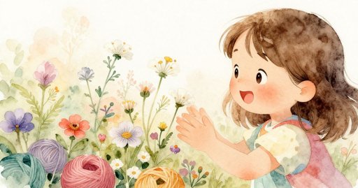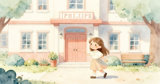 莉莉在明媚午後奔向鄰家,房屋外觀溫馨,花園鮮花盛開,充滿期待與活力的氛圍。
