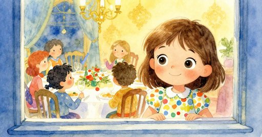 在夕陽餘暉下,莉莉、老師與鄰居齊聚桌旁,分享甜蜜回憶,彼此擁抱,溫馨喜悅彌漫全場。