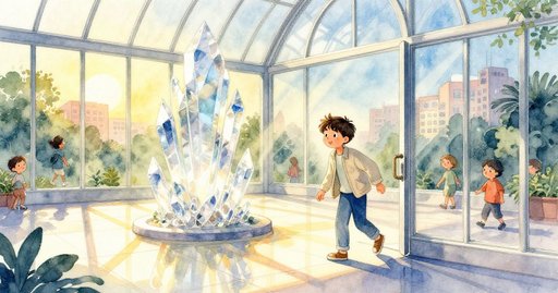 那天下午稍晚,米雅帶著舊相機走進植物博物館。倒扣般的玻璃中庭在頭頂展開,雨後的玻璃面板仍帶著水痕。中央有一座淺淺的裝飾水池,倒映著高懸的花籃。細細的回收水柱自噴嘴落下;水珠落水時產生輕柔的攪動,打亂如鏡的水面。強烈日光穿過流動雲層,為水池劃出一道亮帶。藤蔓上的彩色花瓣紛飛而下,在漣漪上打著旋。遊客的腳步聲與高處葉片沙沙聲交織。她希望捕捉光、水與花瓣短暫交會的那一瞬間。