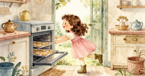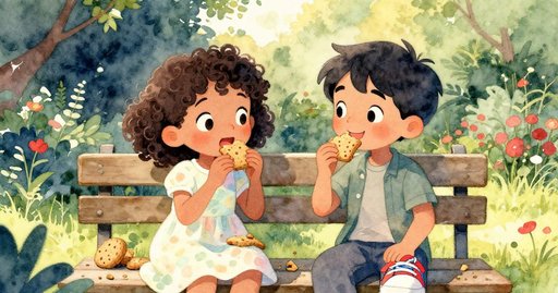 米雅端著小托盤。溫熱麵包飄出香味。她走進花園。陽光在地上留下一道道柔黃。玫瑰旁的小圓桌靜靜等待。米雅把早餐放上桌。她的肚子咕嚕作響,很餓。她慢慢舉起湯匙。沙沙的葉聲晃動低枝。一隻敏捷的松鼠落在她的盤邊。松鼠聞著烤吐司。牠迅速叼起麵包塊。吐司從盤上滑落。