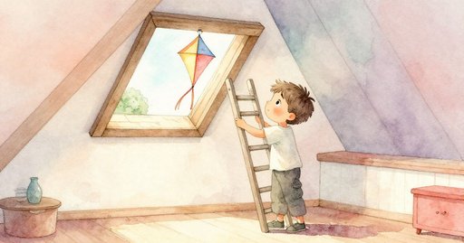 He turns to a small pump. He ties a round balloon. Stars and one planet paint it. Air fills the balloon slowly. The kite lifts with the balloon. Together they finally fly low. They drift above a sandbox. Children clap under the kite. Sudden stronger wind snaps loose. The balloon lets go fast. The kite lands on a branch. Leaves rustle around the tiger. Imagination games begin below it. The branch stays still now.
