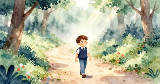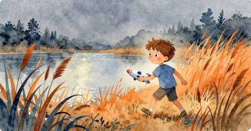 石頭微微滾動。突然的泥土在下方抬起。一隻青蛙迅速跳出並離開。一隻小小的綠色小蟲停在附近。跳動讓樹葉拍動。漣漪畫出明亮的圈。水觸碰草岸。米洛急忙退後一步。船從他手中滑落。它在開闊的水面漂浮。米洛注視著船漂遠。陽光在船身上閃耀。池塘現在保持寧靜。