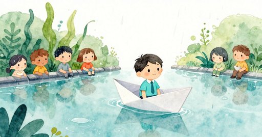 米洛獨自站在池塘旁。他拿著一艘紙船。今天的風很溫和。鳥兒在池塘上方啁啾。柔和的光線照在水面上。蘆葦隨著平靜的漣漪搖動。他把船降向水面。一顆小石頭擋住池塘邊。水在石頭後打圈。米洛蹲在水邊。他的鞋輕敲濕地。米洛把船拉回。