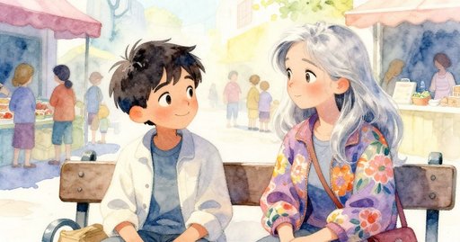 午後的斜陽穿過城市廣場,在多年的足跡磨薄的石板上畫出長長條紋。鐵椅的油漆像乾裂花瓣般剝落,青銅雕像的某些部位因孩童拂摸而泛出亮色。米洛停在噴泉旁,享受暖意,水珠將他的袖子點綴成閃閃銀點。上方一個遠處喇叭傳來沙啞的廣播——帶靜電的搖擺號角——隨即斷聲。旋律的殘響飄過擺滿時鐘、唱片與缺角茶杯的攤位,米洛朝聲音的方向走去,想在攤販收攤前找到那台還能運作的機器。