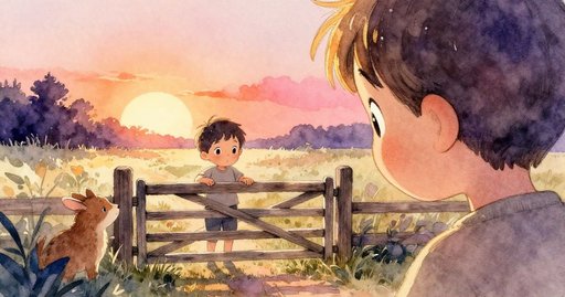 6.小山羊Billy在寧靜庭院中安坐休憩,柔和夕陽灑在柵欄、柱子與綠意盎然的草地上,展現安詳結局。