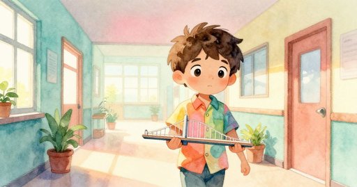 木條四散落在地板上。莉娜跪下,點算每個物件,然後吐了一口氣。時間很短,但她開始解決麻煩。她擦乾濕盒子,再把木塔扶正。接著,她用膠水把橋的部件黏緊。房間保持安靜;只有輕輕的敲擊聲打破沉默。兩支鉛筆相碰,發出和諧的清脆聲。最後,莉娜把做好的橋放到架上。鋸末在她鞋邊落下,她關上蓋子。