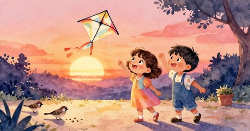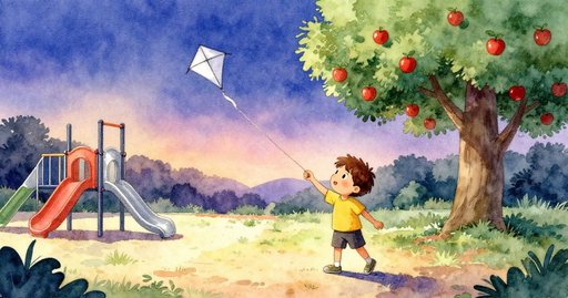 The playground stood quiet after lunch. Warm sunlight lay across the painted hopscotch squares, and chalk dust carried a faint dry smell. Leo spread a bright paper kite on the low stone table near the fence, and Maya unrolled the long string. Their goal was simple: send the kite high before the bell rang again. Leo could already anticipate the first pull of air under the diamond frame. A gentle wind moved the grass, yet benches, trees, and classmates crowded every line he considered for take-off. Maya lifted the kite to her shoulder, but the tail brushed a puddle and grew heavy. They have already tied bright ribbons along the tail, but the water made them sag. A crease of worry crossed her forehead while she wiped the damp cloth against her jeans. The sky above showed blue distance, but the ground around them offered barely a path.