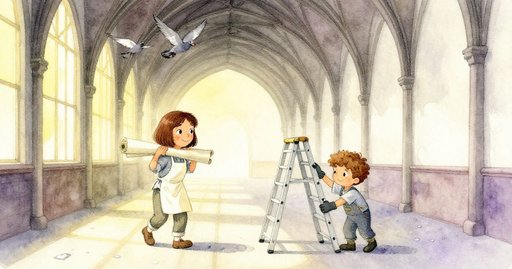雨暫時僅是細霧,但更深的雲層正從山脊逼近。馬特奧一手夾著折好的帆布,另一手推著鋁梯走向社區大樓的屋頂。地面傾斜不平,碎石在靴底滑動;他調整重心,直到兩條梯腳穩穩貼地,再用輕敲測試了兩根梯階。微風扯動他的衣領,上方鬆動的百葉窗響起搖晃聲。他的手機上顯示天氣圖——低解析度把鋒面變成鋸齒狀的炭灰色塊,但螢幕仍提示天黑前將有更強的降雨。