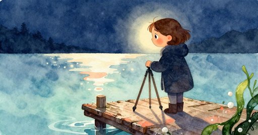 瑪拉向前傾,把相機放到幾乎貼近水面。利奧的黃銅計時器鬆脫,撲通落入水裡;他俯身時,探險者風格的帆布帽也跟著前傾。指尖剛摸到儀器,帶狀海藻纏住錶帶,把它與腳架連在一起。兩人合力,小心把植物解開,沒讓莖葉撕裂。潮水再度後退,水面澄清,最後一張照片把藻叢的紋理收入感光元件。潮池上方,腳架穩穩站立,海霧在金屬腿上漸漸降溫。