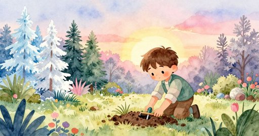 奧莉芙敲倒扣的鐵桶,發出空洞的咚聲。伊恩站在潮濕的草坪上,手裡拿著一杯混濁的水。奧莉芙把彈珠平衡在桶頂,輕輕一推。彈珠滑下邊緣,撞到靠在磚頭上的木湯匙,湯匙向上翻起,柄端戳到一排小積木。一塊積木推動下一塊,最後一塊頂到蔬菜床邊的蔥苗。鬆軟的土壤崩落,露出幾乎銀白的細根。伊恩笑了,倒出細水流進新開的溝,水帶著泥土碎屑往下走,就像私密宇宙裡旋轉的行星,在他們鞋間流動。