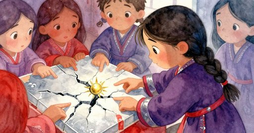 就在這時,稜鏡滑向燈邊又旋轉一次。折射讓一道彩虹光束穿過模板孔洞,鮮豔線條在木板上綻開,先前的眩光側向滑走。兩位助手都被那些顏色嚇了一跳;莎拉笑著把燈降低一點,讓新光束保持穩定。多里安描了一條亮線,當彩虹開始淡去時放下鉛筆。他從未完成的冰河圖前退後一步。莎拉轉向因殘餘色澤而發亮的商人小像,注視著微小火花在光滑漆面上跳動。