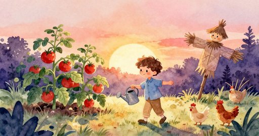 當一股細水流碰到被陽光加熱的石板時,蒸氣發出嘶嘶聲。花椰菜畦旁的石徑完全曝曬在陽光下,熱氣在上方扭曲空氣,而冷水滴則不停從溫室屋簷落下。 一隻機警的松鼠來到小徑邊緣;牠的尾巴抽動,耳朵朝著細碎水聲轉動。籬笆外,一條林地為天空畫出邊框,一隻翠鳥劃過,閃成一抹藍線衝向池塘。番茄的甘甜氣味和陶盆較刺鼻的土腥味混在一起,在溫暖空氣中停留片刻。溫室門旁淺盤裡的新鮮種子正等著,但兩種力量擋住前路:石板灼燙腳掌,落水突如其來地冰涼背毛。