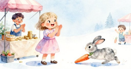 She continues along the row. The crate stays behind her. Another stall shows rising dough. The round top lifts slowly. Steam stays under thin cloth. Maeve passes the bud again. The petals open a little wider. Soft pink edges catch light. Maeve stops near her mother. Her family stands around baskets. They watch the dough puff higher. A pear suddenly rolls toward Maeve. It stops close to her shoe. She lets the pear stay there. The pear stays beside the stone.