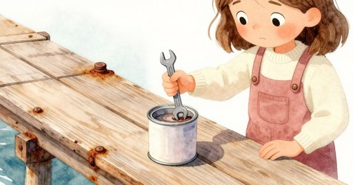 A rusty winch groaned beside the pier, its chain turning once before it stilled. Lily crouched near the posts where old rain had darkened the wood. She set a small brass ornament on its edge and flicked it. The ornament spun, wobbling like a tiny wheel; as it tipped, it nudged a loose gear that someone had left from boat repairs. The gear rolled in a slow arc, caught a coil of wire, and twisted the wire tight. The sudden twist pulled a wooden spool upright, and the spool began to whirl in place, humming across the damp plank.
