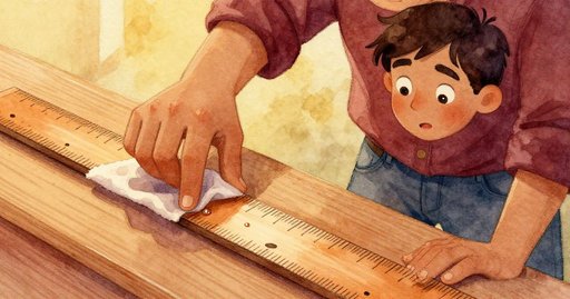 他的手肘擦過帆布包,包角頂到一大罐清洗水。水罐前傾,細水先在桌面噴射,又越過邊緣傾倒。一條排水溝早在數月前就刻在桌面,但水流直接跳過那條槽。斜屋頂下瀰漫著淡淡樹脂味,與從窗戶溜進來的涼爽午後空氣交織。水順著桌腳滑落,加速後濺進地板上的散木屑。濕木屑結成黏稠漿,隨著更多水到來而緩慢外推。這股微小動盪滾動一片單板,像滑板般向門口漂去。門檻外,遠方廣場傳來低沉敲擊聲,動著的碎片卻無人理會。