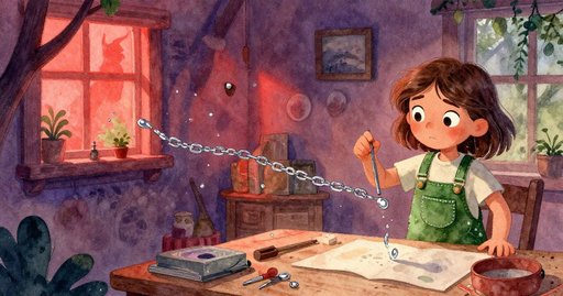 穀粒啪嗒啪嗒落在馬廄門旁的鐵桶上。喬伊停下腳步,乾脆的節奏在夯實的泥地院子裡迴響。一枚馬蹄釘閃過暗光;短暫的火花在日光下跳動。牛舍飄來溫暖空氣,夾著淡淡乾草味。水槽邊,一小堆棕色黏土在陽光下裂開。她捏了一撮,用手掌搓成圓球。扁木板靠在翻倒的牛奶箱上,成了一條小斜坡。她沒多想,就把新球放在頂端輕推一下。小球加速滾下,撞到泥地,又停在她靴邊。她挪動木板,墊高箱子,再以更陡角度試一次。每次都在木面留下細細痕跡。她歪著頭,像安靜的雕塑家般小心操作。