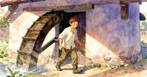 每日黃昏,塞在南牆縫隙裡的麻絮隔熱層總是如一——灰撲撲、糾結成團,帶著河水氣息;今晚,纖維間卻閃出一點銅色微光。里德從未說服自己水車坊會改變,但那一抹亮意仍拉他靠近,輪軸的吱呀與河流的轟鳴擠滿空氣。