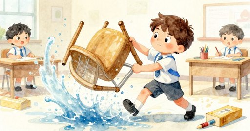 肥皂滑動,撞到一個罐子,把藍色墨水撞翻。