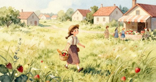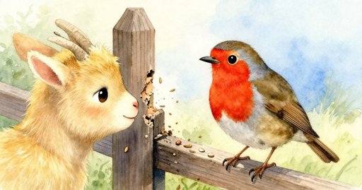 露娜推開木門,收好鬆散的毛線。田牆後傳來柔和的羊叫。一隻小山羊好奇地嗅著那顆掉落的馬芬,接著又嚐了嚐草地上的籃子。三口之內,五個馬芬全消失不見。羊鼻上點點麵包屑像雀斑。露娜驚呼後只能笑出聲。她把最後一個馬芬放在平石上。鳥群在頭頂盤旋,麵包屑隨風飄散。空籃倒在膝旁。她把毛線繫緊,重新踏上上坡的小路。遠處小徑旁傳來一聲鐘響。