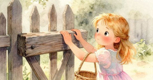 露娜提著一籃六個新鮮馬芬。她想在覆滿草的山頂與人分享。最後一塊田地前,一扇木門擋住去路。她推門,但門閂依舊緊閉。這番努力只留下悶響與些許挫敗。附近的農夫提著水桶向她揮手致意。露娜點頭,再次嘗試。她手肘一滑,籃子撞上木門。一個馬芬滾出,穿過洞口。它撞到地上的一圈亮色毛線,毛線向前散開,纏住了她的腳踝。她連跳帶退才穩住身體。這一下改變了角度,門閂終於滑開。