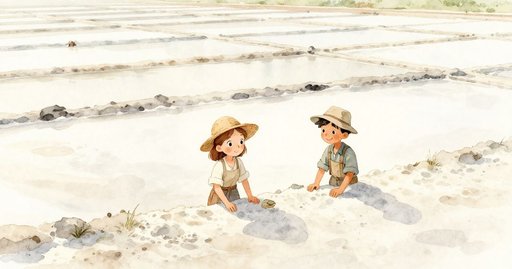 每天黎明,奧莉芙都沿著狹窄的堤岸走向鹽田,這種例行如同灌溉池水的潮汐一樣規律;但今天早上,鹵水面反射出更刺眼的光芒,讓她停下腳步。這片鹽池極少映出如此尖銳的銀光。原本掛著三個絎縫布袋的樁子上,如今只剩兩個,縫線方格在深色木頭前顯得蒼白。那缺口像鬆動的線頭拉扯她原先的確定感。班跟在後面,肩上橫放著長柄手工耙,打磨光亮的齒在日光下閃爍。