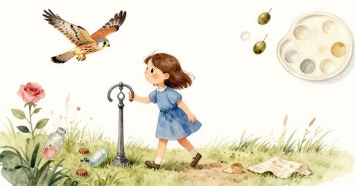 她轉身時,勾住濕草的不是籃子而是綁口的緞帶,那輕微一扯喚醒了掌心久遠的數拍遊戲。沒經思考,手指就在籃緣敲出節奏——拍拍停,拍拍停——正是童年丟石過水的節拍。身體的記憶重排了步幅:十二小步再停,十二小步再停,像擴散的水紋給看不見的草地劃出地圖。進行到一半時,一股更冷的微風掠過小腿,彷彿草地正在吸氣;她立住,才發現身旁的籬柱已經消失,只剩霧氣在呼吸,安靜而慘白。