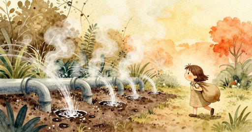 花園灑水器發出連續嘶嘶聲,水柱在粗糙草地上畫出閃亮弧線。德莉亞停在門邊觀察。紅色紙飛機卡在圍籬上,早上的小陣風把它吹到那裡。她想在飛機被水打濕前拿回來。她先研究灑水器的節奏。噴頭轉動五秒,停三秒,再轉回原位。她仔細數了兩個完整循環。清晨柔和的光線填滿小院。
