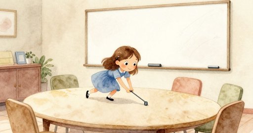 芬恩推著會議室的小推車滑過層壓地板,橡膠輪在載重下發出低沉嗡聲。他把投影機放到橢圓桌面,前臂貼著冰涼的貼面,並拉下投影布;帶紋理的乙烯墜落一半便停住。他蹲在備品抽屜旁,撥開光滑遙控器與某人午休手作留下的木製織線器。筆記本散開,他的指節沾上乾燥墨粉。轉接線藏在下面,緊緊盤繞,他抬起時聞到微弱橡膠味。手指收緊,塑殼擠壓掌心,他努力將纏結一圈圈鬆開。終於放出半公尺時,天花板喇叭喊出他的名字,隨後一聲尖銳震動;快遞員等不了。線仍拖出抽屜,他站直身子,邁向接待處。
