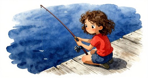 莉莉蹲在柳蔭覆蓋的碼頭中央,膝蓋貼著溫熱而粗糙的木板,細小波紋從縫隙下滑過。瑞德站在穩固的板面上,雙腳張開,抬高釣竿,讓釣線越過柳根。旁邊,一只裝滿麵糰球的草編籃隨著碼頭的微晃左右搖擺。籃柄因為許多湖邊午後已被磨出淺痕。湖面另一側的蘆葦被夕陽染成淡金色,近處的水面則映著漸暗的天空。短暫的間奏裡,湖泊一片靜止;繫船柱上的粗繩也沒有晃動。瑞德吐氣、甩腕,把浮標拋向柳蔭下那塊較暗的水域。細尼龍線穿過導環發出輕響,當餌料入水後便安靜下來。
