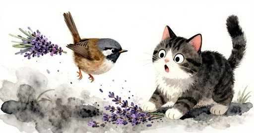戶外場景中,一隻小鳥迅速捕捉雨桶上的種子,遠處薰衣草田延展著故事餘韻,溫馨自然充滿活力。
