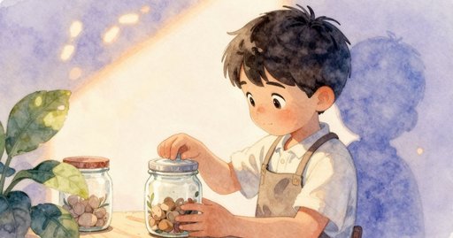 涼涼的玻璃碰在 Lily 指尖上,她把第一個空罐子排在備料檯面。那個喇叭形漏斗先前已被奶奶小心地架在玻璃罐上。深紅果醬沿著漏斗頸部緩慢流下,在窗邊帶著藍灰色的光線下微微閃動。木勺上黏著的糖粒被 Lily 把柄沿緣刮下,壓緊結晶免得變硬。奶奶轉動銅鍋,熟練的手腕讓蒸氣柱升起並霧了窗片。若再有氣泡升得太快,木勺就會立即把泡沫推回。兩片蠟紙圓片放在溫度計旁,明亮窗光下數字仍保持清晰。去年燭光晚餐留下的一對蠟燭平衡在窗台。度假帶回的陽傘磁鐵把食譜卡片固定在支架上,方便隨時查看。