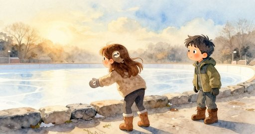 Clyde pressed his palm to the stone border and blinked: the slab felt almost warm, though the air still cut across his cheeks like fine needles. He and Oona had agreed on a simple race—reach the far bank of the three-pace rink before the edges melted away. Yesterday’s downpour had filled the hollow; night frost turned the water into cloudy blue-grey glass, trapping scraps from last month’s parade under the surface. A faded tulip petal lay near the rim, frozen upright so that its thin ridge rose above the ice. Clyde pushed off, but his boot struck that ridge, jerked sideways, and stopped his glide. He rocked back, tried to sweep the bump flat with a short wooden broom, and heard only a gritty scrape; the petal stayed locked in place and the lost seconds let the soft edge weaken further.