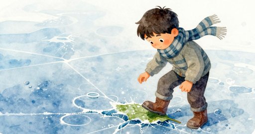 克萊德把手掌按在石頭邊緣,驚訝地發現那塊石板竟有些溫熱,而刺骨寒風仍像細針般刮著他的臉。他和奧娜約好一場小比賽——在邊緣融化前,先滑到對岸即勝。昨夜的傾盆大雨填滿了低窪處,夜霜把水凍成灰藍色的玻璃,並將上個月遊行的紙屑鎖在冰下。邊緣處,一片褪色的鬱金香花瓣直立凝結,薄薄的脊線微微凸起。克萊德推步出發,靴底卻撞上那條脊線,猛地側滑停住。他往後晃,試著用短木掃帚把凸起磨平,只發出沙沙聲;花瓣紋絲不動,拖延的幾秒讓薄冰繼續軟化。