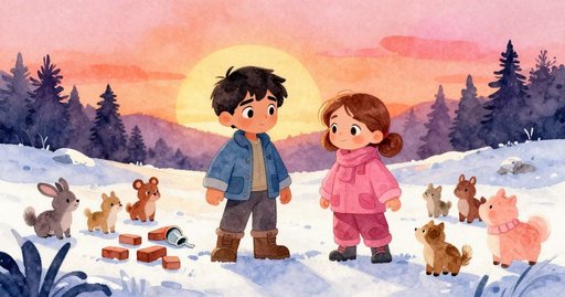 Wet snow pressed into Lucia's woollen palms, turning stiff fabric smoother under the new moisture. She tipped the plastic mould. A solid blue-white brick slid onto the growing wall, its edges shining against the older grey row below. A silver-feathered sparrow fluttered down, landing by the new brick so lightly the surface barely dented. Petra, working in the brick-moulding zone, scooped another load near the buried garden bed. There dense, sticky snow waited under a thin crust. Lucia had to stretch to reach the wall top. The height already touched her waist, and the entrance gap looked narrower than planned. When they began, Lucia had murmured a quiet vow that the gap would stay wide enough to crawl through later. A promise of extra support lay in the bucket of water on the porch. The bucket stood ten slow steps away, and fresh flakes kept thickening on the path. The shovel, once propped against the fence, slid suddenly, struck the wood with a dull clang, and disappeared into a drift.