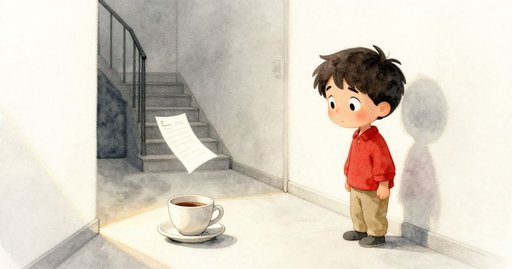 男孩Vaughn在走廊遠處靜觀,光影交錯映出熟悉景致與細微痕跡,氛圍平靜溫暖,寓意一天結束。