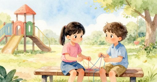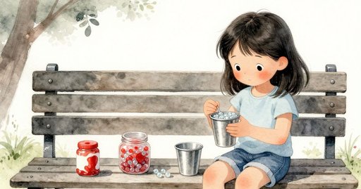 芙莉達撐開工作線,內爾傾倒珠杯,把銅色珠子導到中心線。幾顆珠子在溫熱木面上滾動,穿過窄縫後有一顆掉到草地。內爾蹲下,用小枝把逃跑的珠子撥回杯裡,趕在編帶鬆脫前。兩人再編三行,每行中央穿上焦糖珠,直到手環平整。芙莉達把編帶繞在內爾手腕,邊緣終於平順無縫。他們收好線材,計畫回家把狐獴貼紙貼在禮卡上。傍晚時,橙光照在空長椅,扶手上的膠帶線呈現暗金色。椅腳旁,那顆被遺忘的玻璃珠仍靜靜躺在草間,反射最後一道微光。