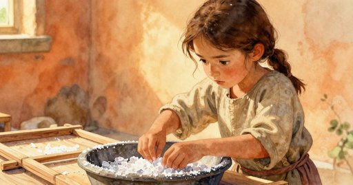Water sloshed against the stone basin as Ira tipped a wooden bucket of spring water over the piled salt. Earlier, the wet salt had been pressed flat by the rake, forming a saucer that caught the water evenly. The crystals shifted under the downpour, releasing a tantalizing squeak where rake marks still lined the heap. He had added the first basket moments earlier, yet a faint grey cloud still drifted through the rinse, so he decided another wash would bring the ultimate brightness the drying rack displayed in morning lessons. Vivian crouched nearby, balancing on the firm centre of the walkway, her pencil moving while she compared grain sizes between the shallower and deeper scoops. Sun beat on their hats, and the clay beneath Ira’s sandals radiated a steady warmth up his calves.