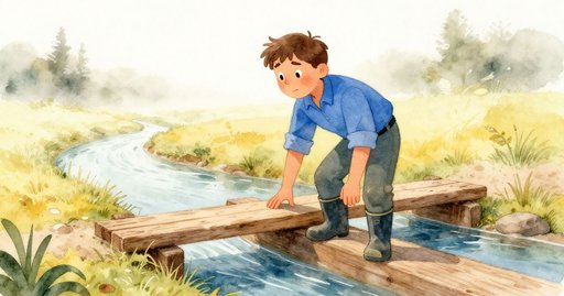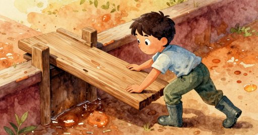 A satchel stitched with faded canvas, a long-handled rake, and a grease tin glimmered under the mid-morning glare beside the knee-high dam. Oona, rubber boots flashing with water reflections, braced both palms on the nearest sluice board. The sunlit surface of the plank dazzled her eyes, yet the swollen wood refused to slide. Water pressed against the shadow-edged groove, hissed around her fingers, then slipped past toward the wheel. Once more she leaned forward, timing her push with the wheel’s slow clap. The board stayed firmly wedged; only a dull creak answered her effort. Behind her, the graceful spray from each paddle threw moving bands of brightness across the stone.