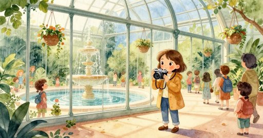 硬幣碰擊石盆發出叮噹聲。科蕾特捧著玻璃生態箱走近時,另一位遊客的手已經把硬幣灑進噴泉。她把生態箱放在窄窄的檻上;裡頭,一株帶著紫邊的三色堇向著光線傾斜。她的目標很簡單:拍下一張以水弧為背景的清晰照片。噴泉吐出微涼水霧;水珠迅速覆在弧形玻璃上,乳白薄膜立刻浮現。她還沒擦完第一次,霧氣已經在上緣凝結。她再度用袖子擦拭,可新的水霧在布離開玻璃前又重新堆積。罐下的石面閃閃發亮,小容器似乎要向盆中央滑去。
