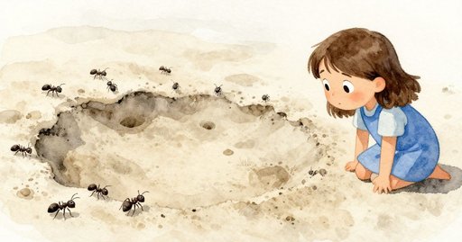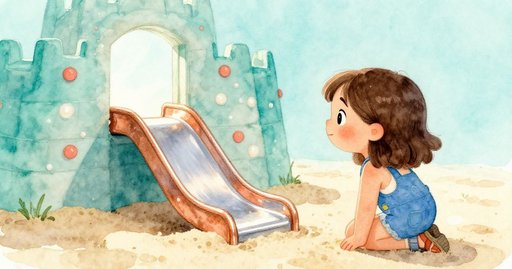 微風掠過沙坑,在表面掀起一層涼意的閃光,散落的紋路裡短暫閃現靈感,卻仍改變不了沙子的乾燥。伊德里斯改變策略,往更深處挖去,塑膠盤在表層下兩指處碰到較重、較暗的濕沙;濕氣貼著盤緣,暗示下方埋著管道。他把濕沙抓起壓向基底,再層層交錯堆疊,讓重力自然壓緊,於是先前失敗的位置挺起一座低矮而穩固的塔。當他終於退後一步時,注意到木框邊已出現一道銀暗的濕痕——原來那股悄悄滲出的水一直支撐著他的作品,只是他從未留心。濕涼的砂粒黏在他的手掌和袖口內側,當他離開沙坑走向攀爬網時仍能感覺得到。