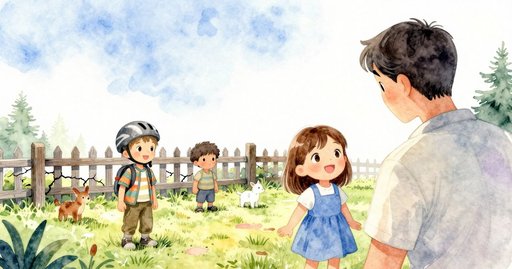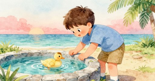 Drip, drip, water taps. Amos sits on the bench. Warm air rests around him. Grass smells fresh and sweet. Morning light paints bright spots. Another child waves, "Hi." The duck wings clap nearby. Cool drops spot his cheek. A squirrel darts along railing. A small milk crate tips. Dust puffs under the crate. It slides and bumps his shoe.