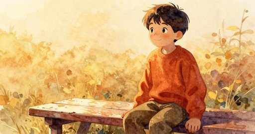 滴答、滴答,水聲敲擊。阿莫斯坐在長椅上。暖空氣包圍著他。草地聞起來清新又甜。晨光灑下亮點。另一個孩子揮手說:「嗨。」鴨子拍翼發出啪聲。涼水點落在他臉頰。松鼠沿著欄杆竄動。一個小木箱翻倒。木箱下揚起灰塵。它滑動後撞到他的鞋。