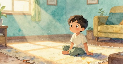 3.從低角度看見柯賓伸手追趕地毯上移動的陽光, 室內充滿晨光, 充滿探索與期待的瞬間