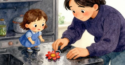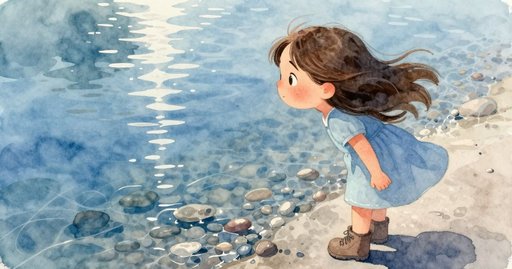 Juno 抓著一根短短的樹枝。她跪在寬寬的水窪旁。水珠滴落。細枝黏住石縫。濕石在陽光下閃亮。她的玩伴 Haida 拿著一片平葉。空氣涼涼的。Juno 把葉子放下。她輕輕按住中央。水滑過邊緣。葉子翻轉又沉下。Juno 再次撈起濕葉。一張小記憶卡躺在旁邊。Haida 把卡片塞到葉下。小船穩穩漂著。一隻麻雀輕輕落在近處。水紋迅速擴散。小船隨每一次起伏前進。Juno 和 Haida 給彼此一個快速又濺水的擁抱。他們噴水跑向敞開的門口。