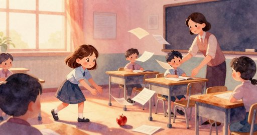 She pushes the cup with a soft pillow. It slides, tips again, pencils scatter. She gathers them. She wraps the folded cloth around the cup. The cloth loosens; the mix of colours wobbles. The cup leans. She lays a wooden block on the table. The block makes a flat platform. She sets the cup on the block. The cup stays upright. Quiet colour lines point upward. Outside the closed window, a small blue bird perches.