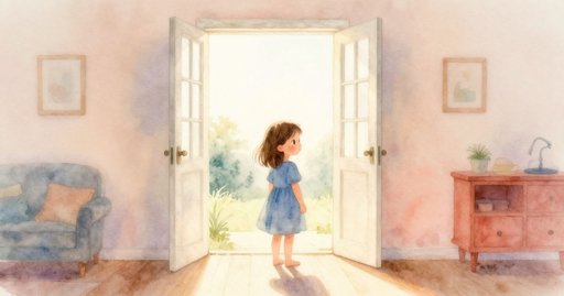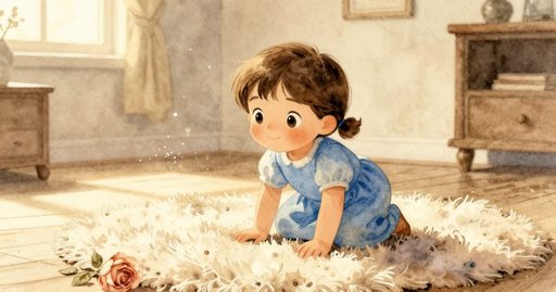 A clean laundry smell drifts in. Prue sits on the thick rug. A cup of coloured pencils lies sideways. Bright light glows on the wood. Light shifts. She lifts the cup toward the table. A glass of water waits beside a small lamp. The pencils tap and ring, like a cheerful song.