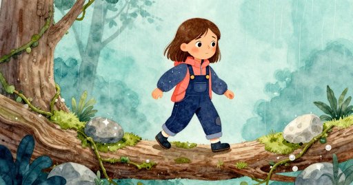 Three short strips of adhesive tape clung to the cardboard core; the outer layers had sagged and turned translucent in the drizzle. Ruby pressed the roll back into her pocket and studied the fallen trunk that ruled the garden path–like trail. Steel-grey bark glimmered under a film of rain, and silver droplets slipped from the canopy onto puddles that quivered like tiny mirrors. She wanted a dry way across before the moss became slippery as soap. From the branch debris zone she dragged a thick limb, lifted its damp weight onto the log top surface, and nudged it until one end rested on the firmer strip of ground beside the trunk.