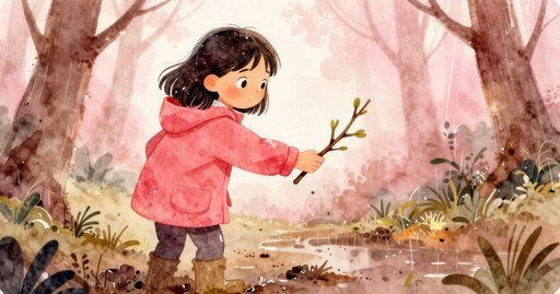 粗枝微微下陷,她又加了一根較細的枝作平衡;枝條落下時,溝槽水花濺起。正在附近撿柴的 Freya 連忙趕來,拿著細枝比手畫腳,空中劃出假想的落腳點。「用扁的一面試試,」她說,聲音幾乎被雨聲淹沒。Ruby 又找來第三根多節枝條,塞進前兩根之間,臨時梯卻因不穩而顫抖。她靴下被壓扁的覆盆子在苔面留下深紅污痕,提醒她表面已軟。就在此時,一隻刺蝟從根盤牆下的縫隙晃出,藍黑色刺閃著光,突如其來的動靜令兩人僵住。