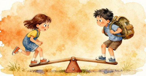 正午的光線已在遊樂場上投下銳利條紋,莉奧菈再次踏上她熟悉的木質蹺蹺板。支點的影子像尺般筆直切過她的膝蓋,金屬把手的強烈反光讓她眨了眨眼才握住那發燙的彎管。附近長椅上一位家長翻著書頁,水瓶半遮在側。迪恩坐在對面座位,他的運動鞋踩在被無數次落地硬實的裸土上。他們的計畫很簡單:讓板子整整齊齊地懸在空中一個呼吸的時間。第一次升降就出現麻煩,迪恩較重的一端伴隨緩慢的吱嘎聲下沉,莉奧菈的雙腳則被抬向明亮空氣。她向前挪了一個手寬,板子回擺卻過頭,悶聲撞在橡膠緩衝墊上。