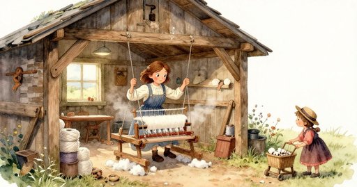 每天下午,Yvette 都會把胡桃木小椅更貼近地面織布機,那是自去年冬天以來絲毫不差的位置。今天,一隻鷦鷯掠過被陽光曬得透亮的經線,在拍擊杼木上停住,好像這裡本就屬於牠。「嗨,小傢伙。」她低聲說,話語在充滿羊毛氣息的空氣裡折疊,輕輕落在線群之間。生羊毛帶著微甜的腐熟味,混著漿糊的粉氣;鳥翅扇出的細風把這股混合香推向她的鼻尖。指尖輕撫線束,細線嗡然,聲音像松脂黏在松皮上,黏住那股麝香味。織布機、那隻鳥、以及漂浮的味道在一瞬間靜默成一個無名的三角。